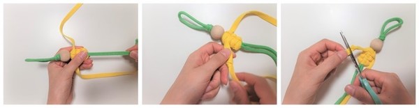 5. 노란색끈을 우드볼 쪽으로 당겨준다. 각각의 끈을 묶어 손과 발을 만든다. 묶은 부분 바로 밑을 잘라준다.