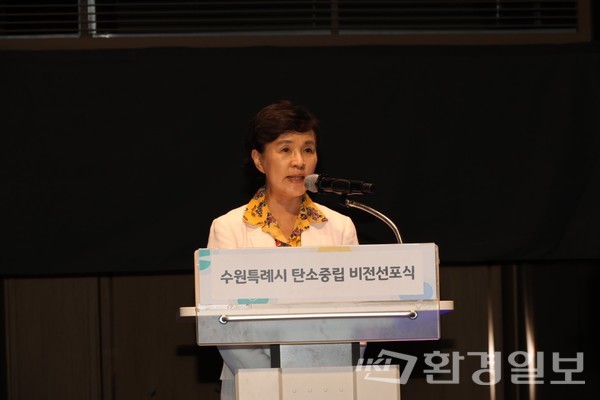 [수원컨벤션센터=환경일보] 박준영 기자 = 4일 오후 2시 수원컨벤션센터 3층 컨벤션 2홀에서 열린 ‘수원특례시 탄소중립 비전선포식’에서 강금실 경기도 기후대사와 이상협 국가녹색기술연구소 소장이 축사를 하고 있다.