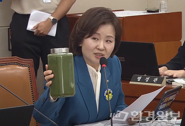 예상된 대로 ‘4대강 보’ 관련해서 여‧야의 양보 없는 논쟁이 벌어졌다. 국회 환노위 간사인 이수진 더불어민주당 의원은 국감 이틀 전에 영주댐에서 직접 떠온 녹조를 4대강 댐의 부작용 증거로 제시했다.