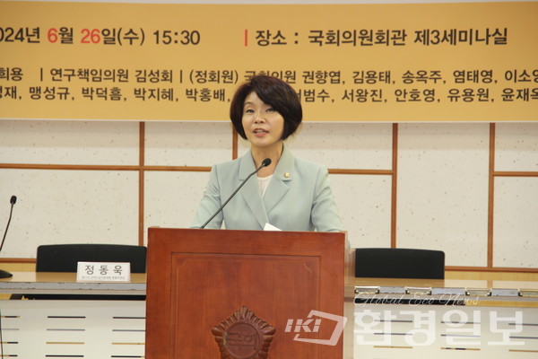 한정애 의원은 개회사에서 탄소중립 이행을 위한 합리적 전력 수급 방안을 함께 모색해 달라고 부탁했다. /사진=박준영 기자 [국회=환경일보] 박준영 기자 = 26일 개최된 ‘제11차 전력수급기본계획(안) 국회 공청회’에서 한정애 국회의원(포럼 대표의원)이 개회사를 하고 있다.