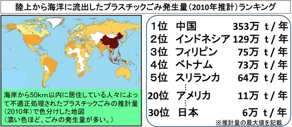 地球の70%は海でできているが、温暖化に伴い海洋汚染が深刻化している。特に問題となるのが、ペットボトルのキャップやストロー、プラスチックなどのごみが原因の「マイクロプラスチック問題」だ。陸から海に流出するプラスチックごみの排出量調査(2010年推計)では、中国が1位、東南アジア諸国が続き、日本は年間6万トンで30位となっている。