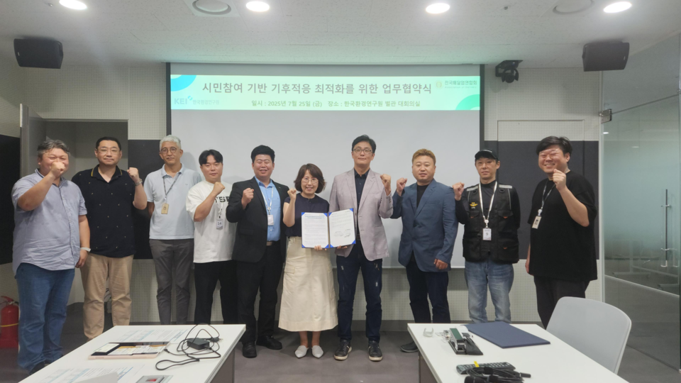 [환경일보] 한국환경연구원(KEI, 원장 김홍균)과 전국배달업연합회(협회장 김운월)는 7월 25일(금) ‘시민 참여형 기후적응 최적화를 위한 시민·사회·경제·환경 데이터 분석을 통한 정책 평가기술 개발’ 사업의 원활한 추진을 위해 상호 협력 업무협약(MOU)을 체결했다.