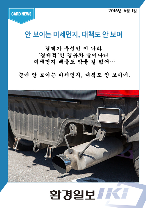 알랑가 몰라…안 보이는 미세먼지, 대책도 안 보여 2016-06-01 편집국 [환경 카드뉴스] 경제가 우선인 이 나라 ‘경제적’인 경유차 늘어나니 미세먼지 배출도 막을 길 없어…눈에 안 보이는 미세먼지, 대책도 안 보이네.